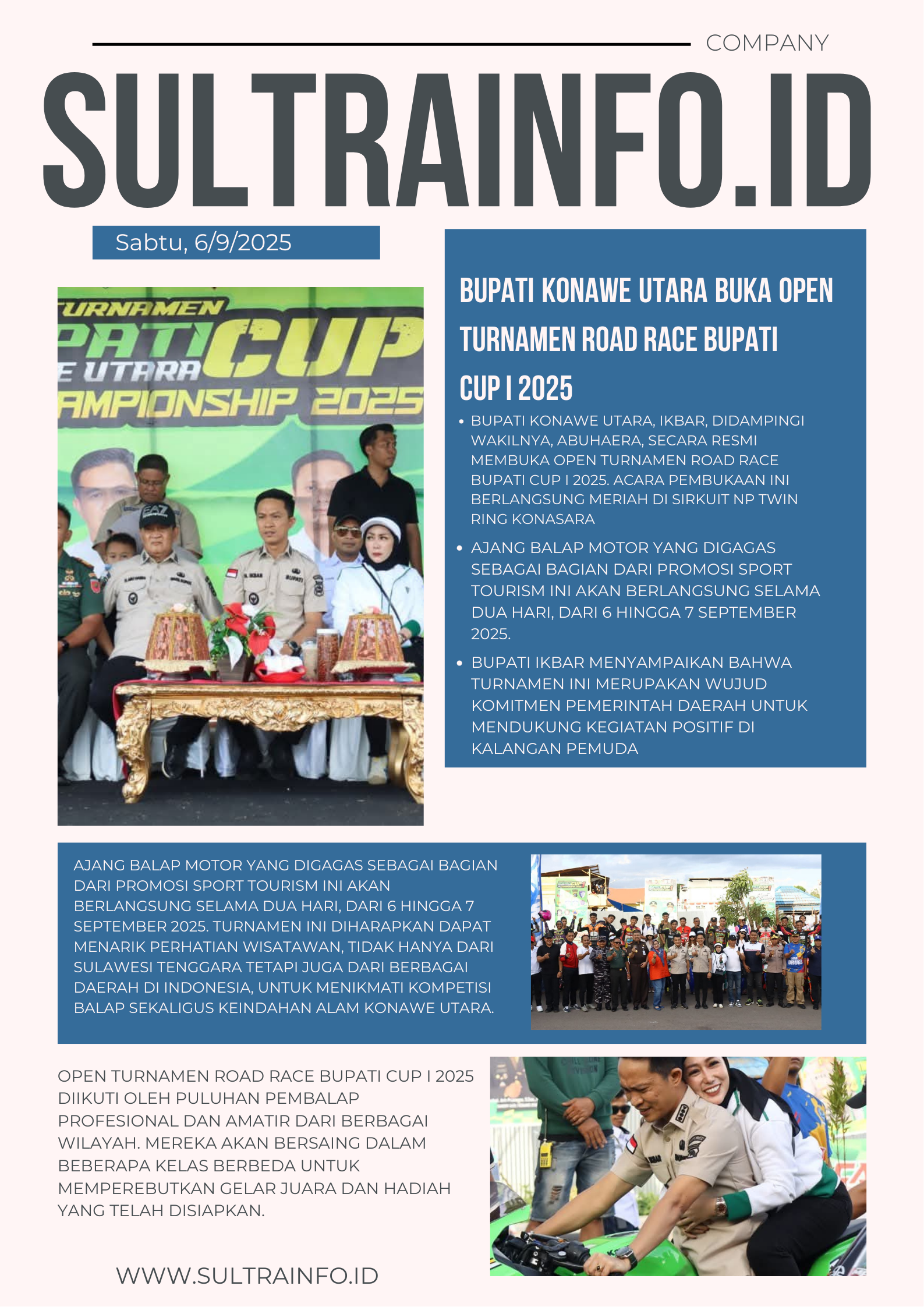 Bupati Konawe Utara, Ikbar, didampingi Wakilnya, Abuhaera, secara resmi membuka Open Turnamen Road Race Bupati Cup I 2025. Acara pembukaan ini berlangsung meriah di Sirkuit NP Twin Ring Konasara pada Sabtu (6/9/2025).