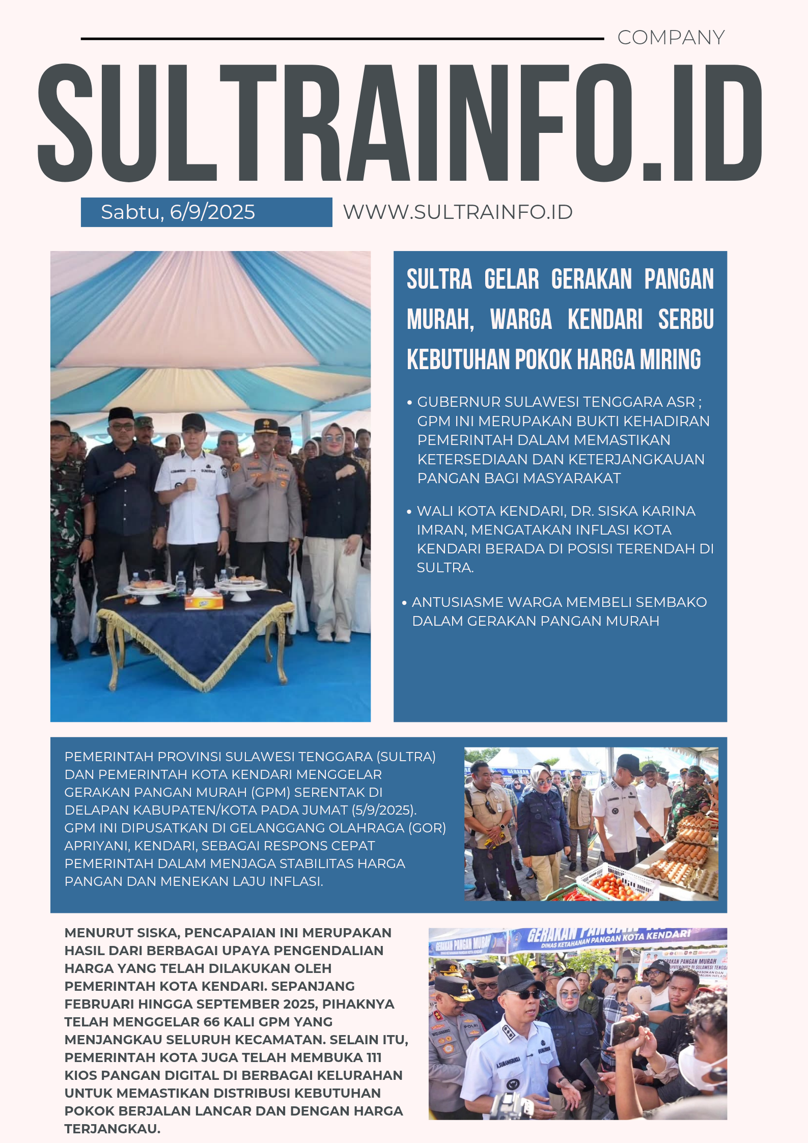 Pemerintah Provinsi Sulawesi Tenggara (Sultra) dan Pemerintah Kota Kendari menggelar Gerakan Pangan Murah (GPM) serentak di delapan kabupaten/kota pada Jumat (5/9/2025). GPM ini dipusatkan di Gelanggang Olahraga (GOR) Apriyani, Kendari, sebagai respons cepat pemerintah dalam menjaga stabilitas harga pangan dan menekan laju inflasi.