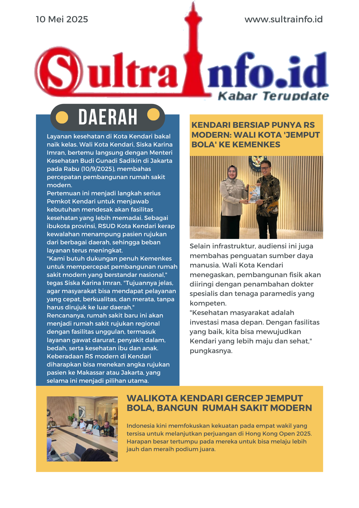 Layanan kesehatan di Kota Kendari bakal naik kelas. Wali Kota Kendari, Siska Karina Imran, bertemu langsung dengan Menteri Kesehatan Budi Gunadi Sadikin di Jakarta pada Rabu (10/9/2025), membahas percepatan pembangunan rumah sakit modern.