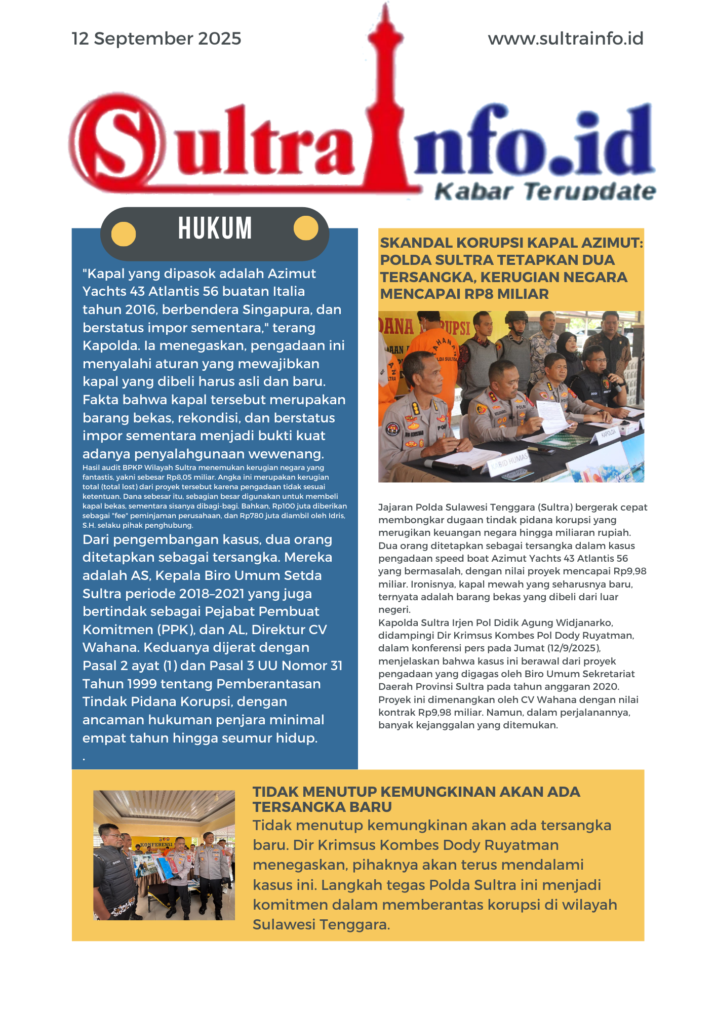 Jajaran Polda Sulawesi Tenggara (Sultra) bergerak cepat membongkar dugaan tindak pidana korupsi yang merugikan keuangan negara hingga miliaran rupiah. Dua orang ditetapkan sebagai tersangka dalam kasus pengadaan speed boat Azimut Yachts 43 Atlantis 56 yang bermasalah, dengan nilai proyek mencapai Rp9,98 miliar. Ironisnya, kapal mewah yang seharusnya baru, ternyata adalah barang bekas yang dibeli dari luar negeri.