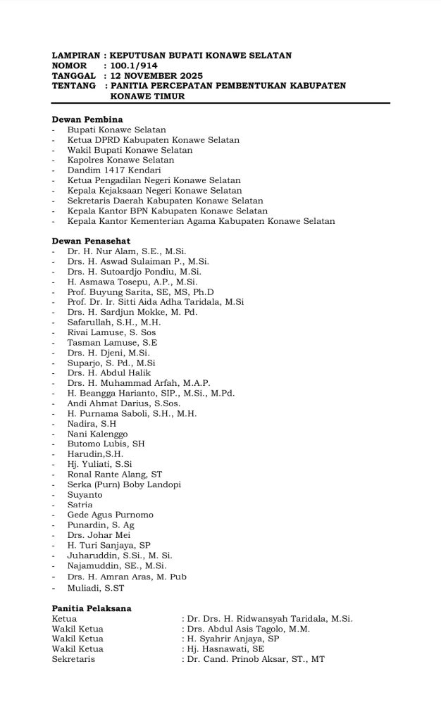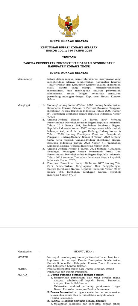 Aspirasi masyarakat untuk memiliki daerah otonom baru (DOB) akhirnya memasuki babak krusial. Bupati Konawe Selatan, Irham Kalenggo, secara resmi mengeluarkan Keputusan Bupati Nomor 100.1/914 Tahun 2025 tentang Panitia Percepatan Pembentukan Daerah Otonom Baru Kabupaten Konawe Timur. Keputusan ini ditetapkan di Andoolo pada tanggal 12 November 2025.
