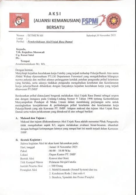 Aliansi Kemanusiaan Bersatu yang merupakan bakal melakukan aksi unjukarasa di depan Kantor PT. Indonesia Morowali Industrial Park (IMIP). Hal ini berdasarkan surat pemberitahuan aksi yang dilayangkan kepada pihak Kepolisian Resort (Polres) Morowali, Senin, 10 November 2025.