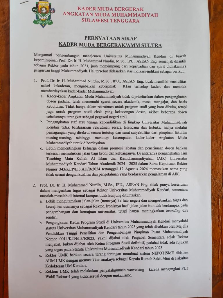 Suasana internal Universitas Muhammadiyah Kendari (UM Kendari) tengah memanas setelah beredarnya dua surat terbuka berisi pernyataan sikap dan tuntutan keras dari kelompok yang menamakan diri Kader Muda Bergerak Angkatan Muda Muhammadiyah Sulawesi Tenggara (AAM Sultra). Surat-surat tersebut secara eksplisit menargetkan kepemimpinan Rektor UM Kendari, Prof. Dr. Ir. H. Muhammad Nurdin, M.Sc., IPU., ASEAN Eng., menuduhnya melakukan serangkaian pelanggaran serius yang merugikan kampus dan mengabaikan prinsip-prinsip organisasi Muhammadiyah. Hal dikatakan Humas Kader Muda Bergerak Angkatan Muda Muhammadiyah Sulawesi Tenggara, Adyansyah tegasnya.