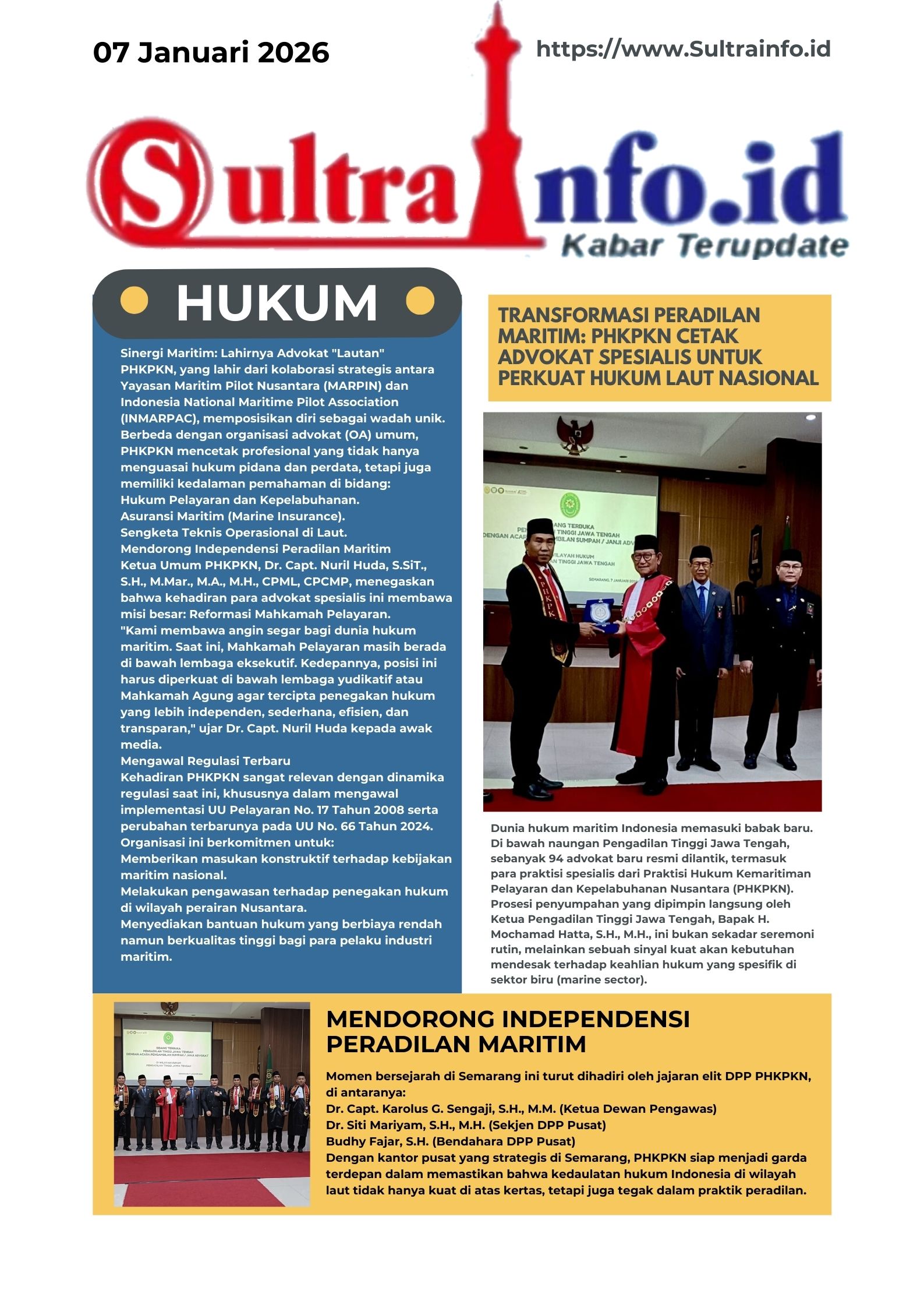 Dunia hukum maritim Indonesia memasuki babak baru. Di bawah naungan Pengadilan Tinggi Jawa Tengah, sebanyak 94 advokat baru resmi dilantik, termasuk para praktisi spesialis dari Praktisi Hukum Kemaritiman Pelayaran dan Kepelabuhanan Nusantara (PHKPKN).